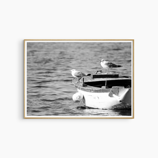 Seagulls on Boat Print, Black and White Nautical Wall Art, Printable Coastal Bird Photography