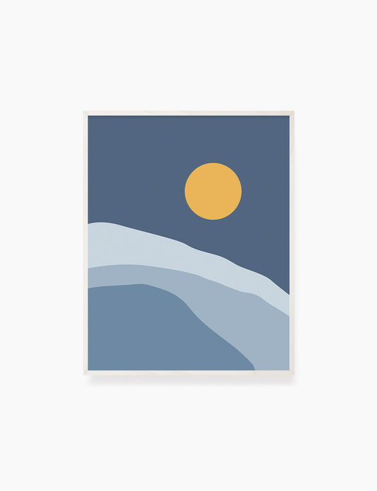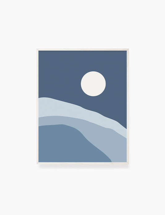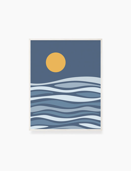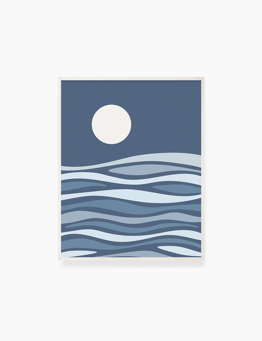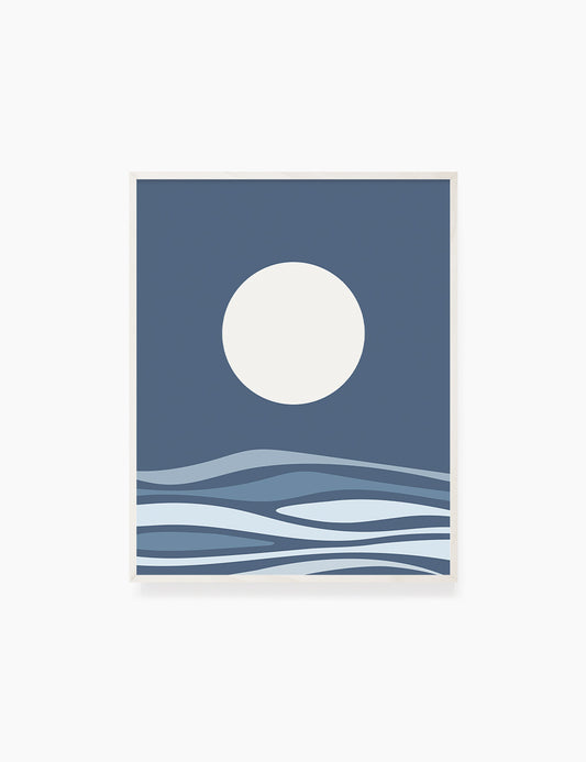 FULL MOON OVER THE BLUE OCEAN WAVES. Boho Art. Minimalist. Abstract.