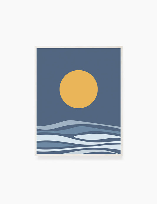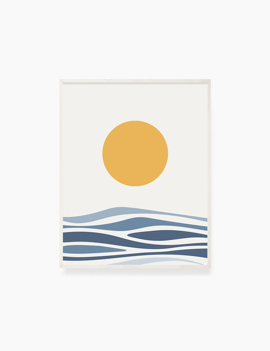 SUN OVER THE BLUE OCEAN WAVES. Boho Art. Minimalist. Abstract.