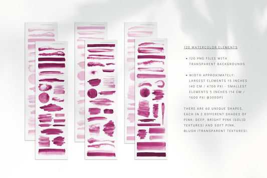 120 Watercolor Texture Elements 01 Pink, Watercolor Shapes, Splotches, Brush Strokes
