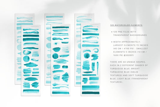 120 Watercolor Texture Elements 01 Turquoise Blue, Watercolor Shapes, Splotches, Brush Strokes